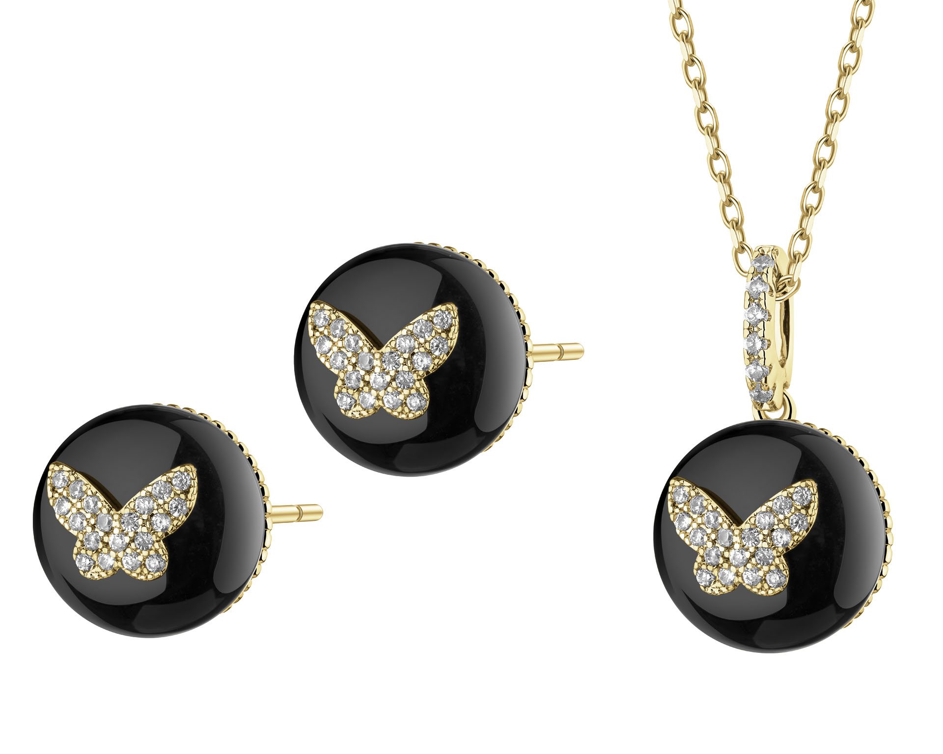 Kolczyki i naszyjnik z mosiądzu pozłacane z cyrkoniami i agatami - komplet - motyl