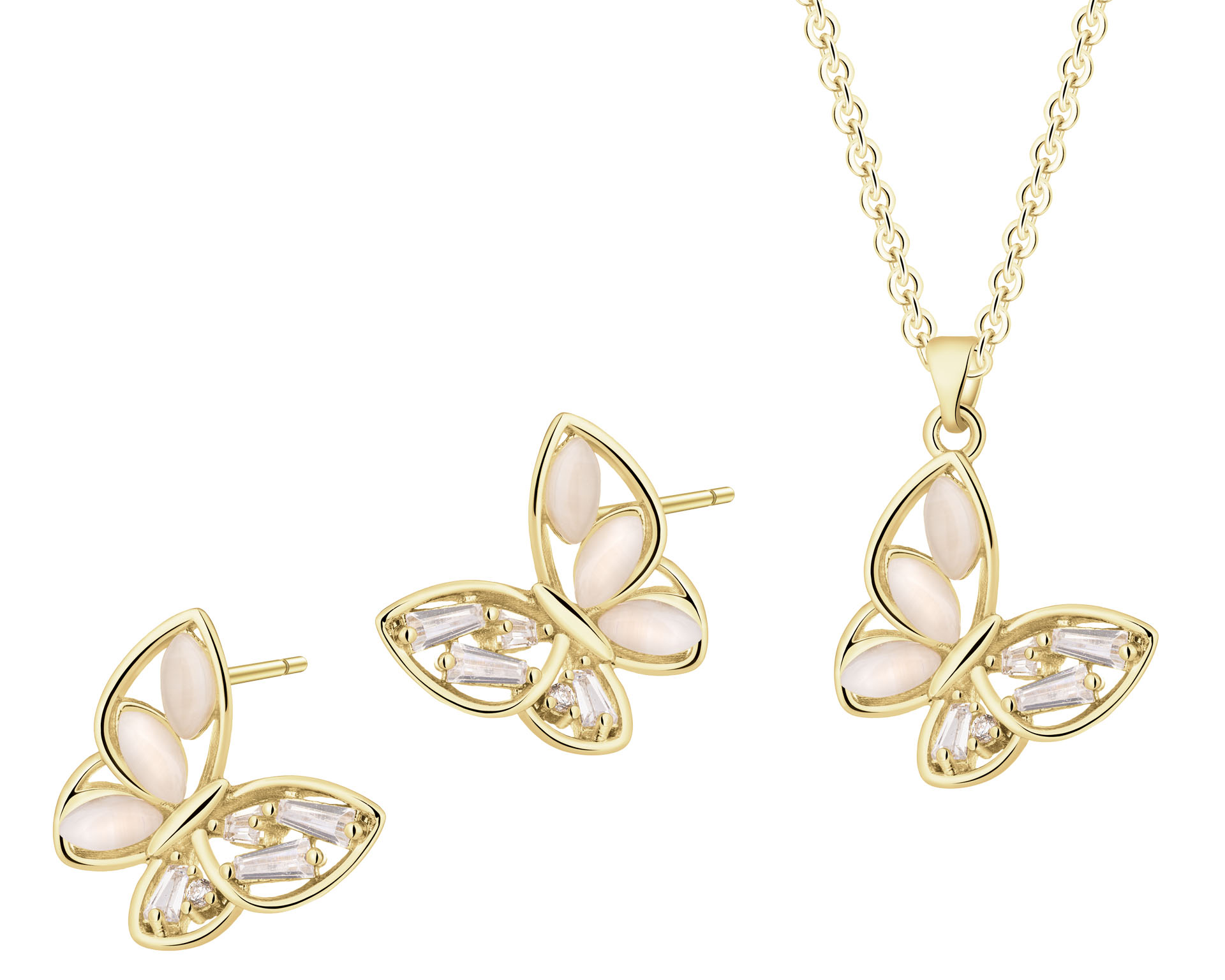 Kolczyki i naszyjnik z mosiądzu pozłacane z cyrkoniami i kocim okiem - motyle